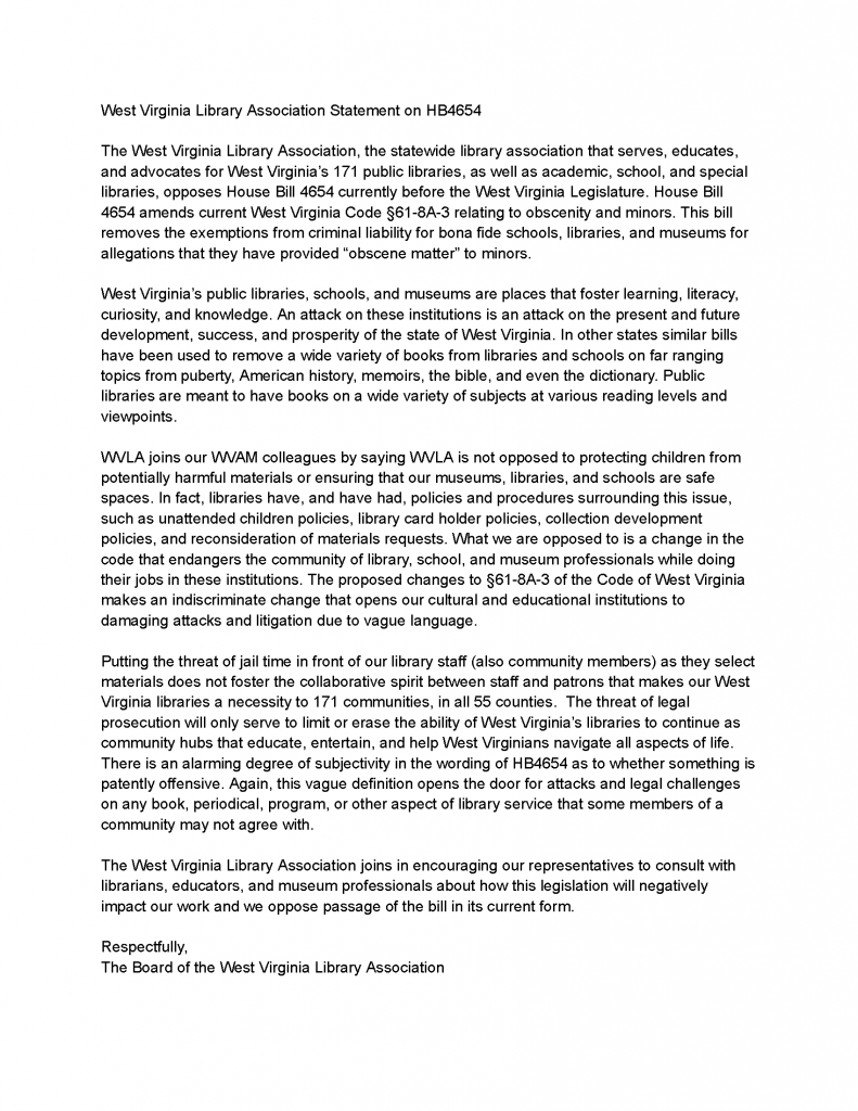 West Virginia Library Association Statement on HB4654